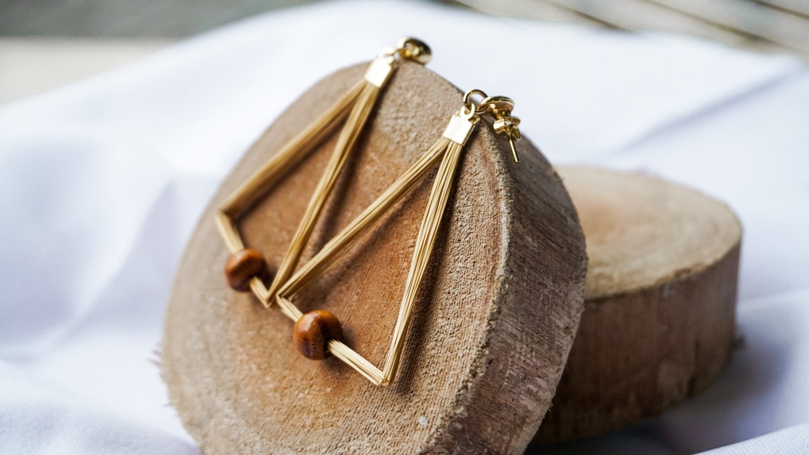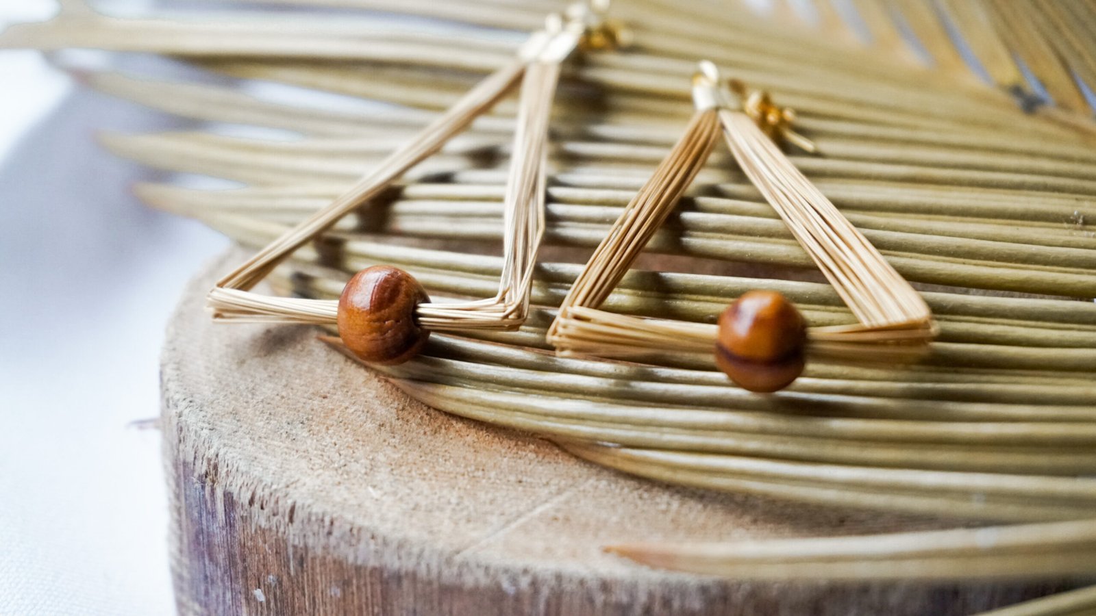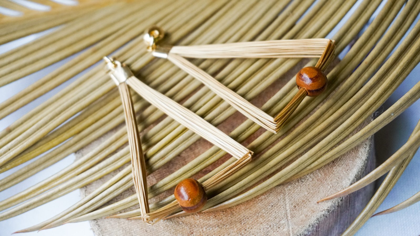 Par de brincos em capim dourado, com ferragens em metal dourado e detalhe em madeira, medindo aproximadamente 5 cm de comprimento cada um.