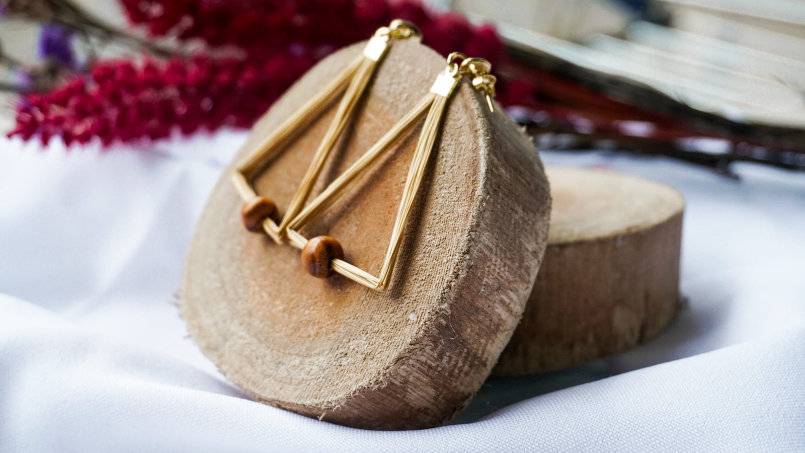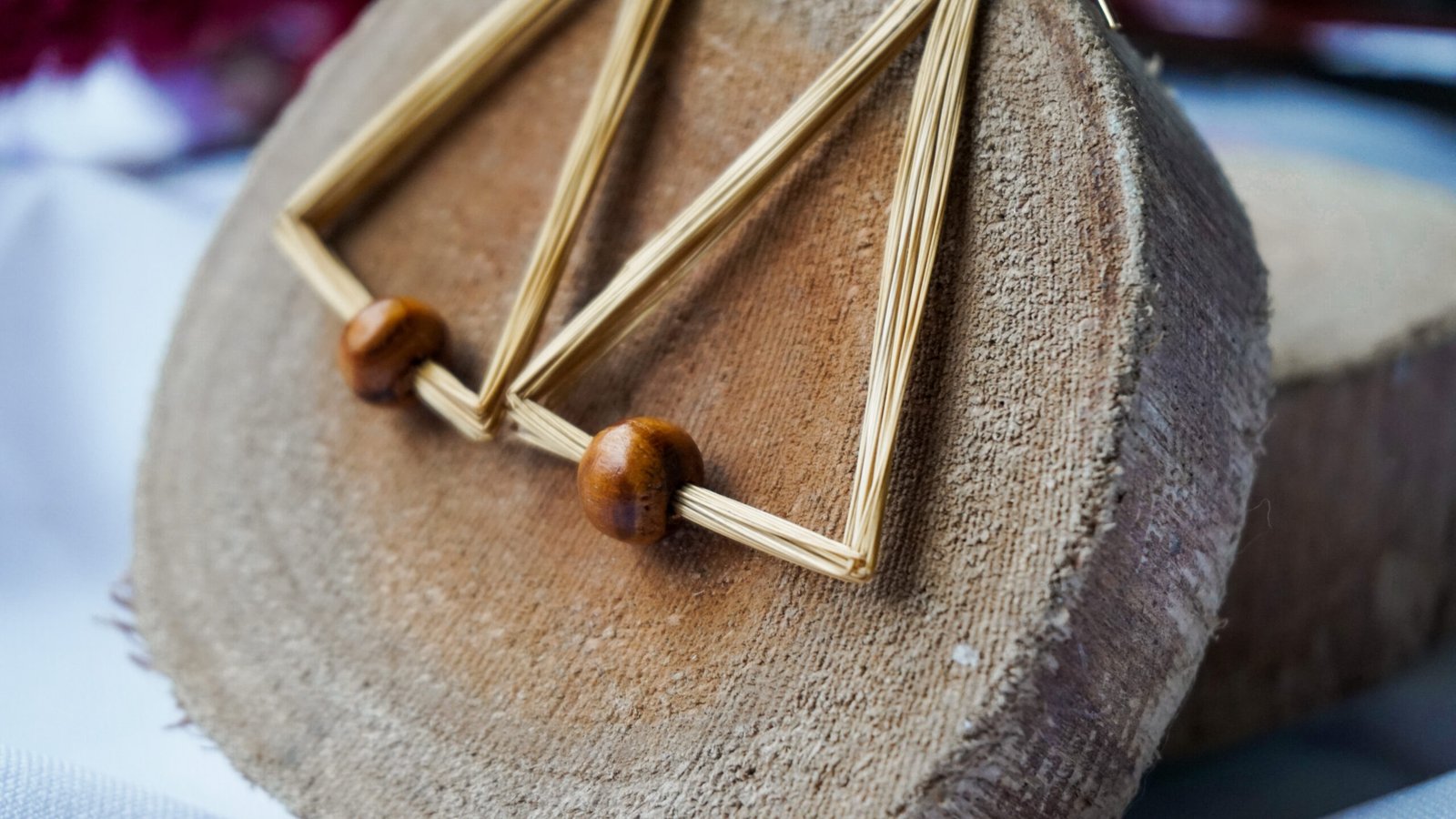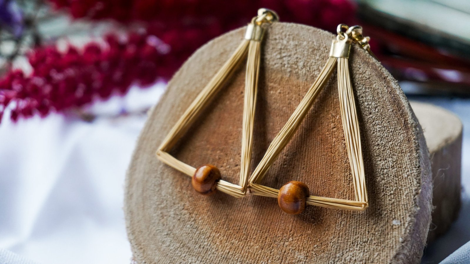 Par de brincos em capim dourado, com ferragens em metal dourado e detalhe em madeira, medindo aproximadamente 5 cm de comprimento cada um.