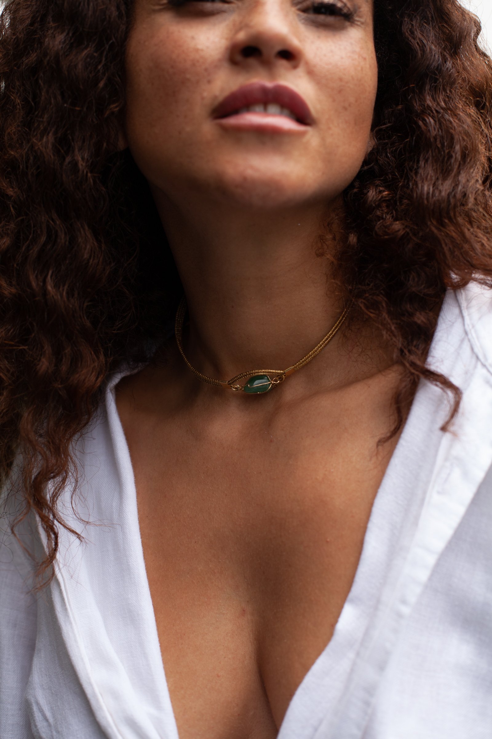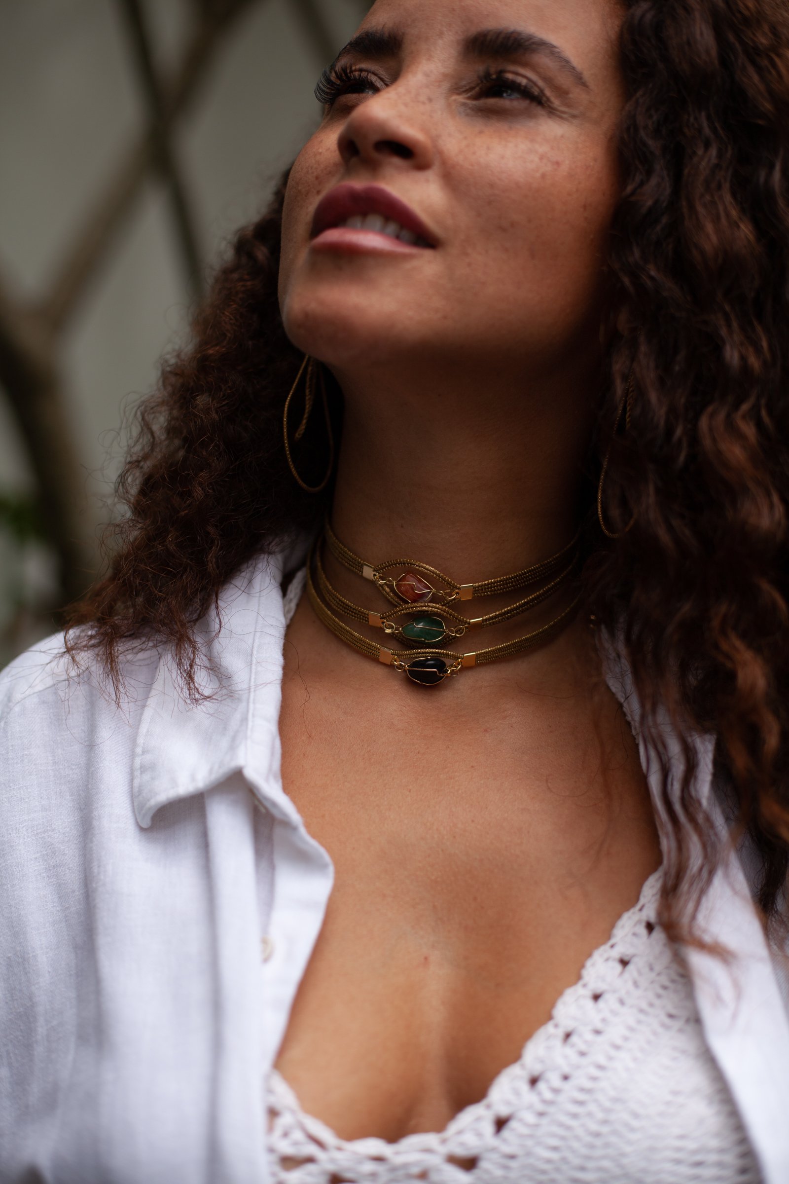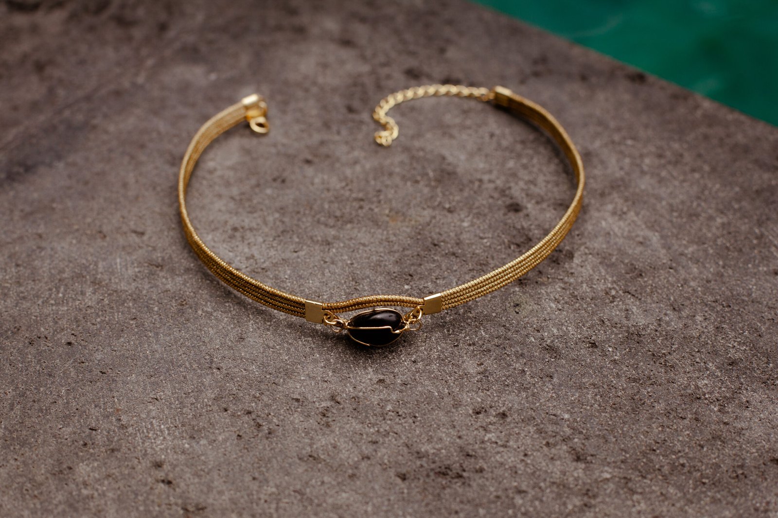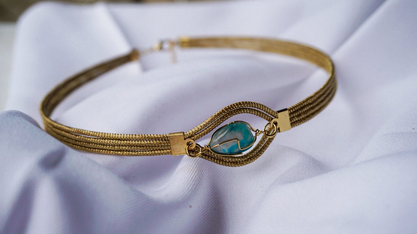 Colar modelo gargantilha em capim dourado, com pedra brasileira natural e ferragens em metal dourado medindo entre 12 cm e 14 cm (regulador de 2 cm).