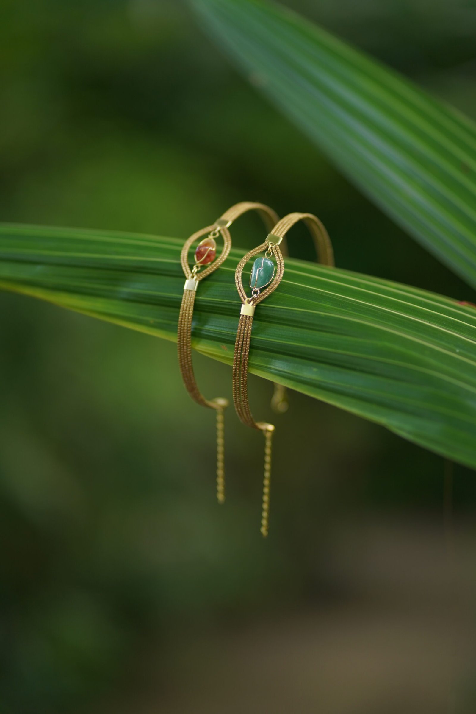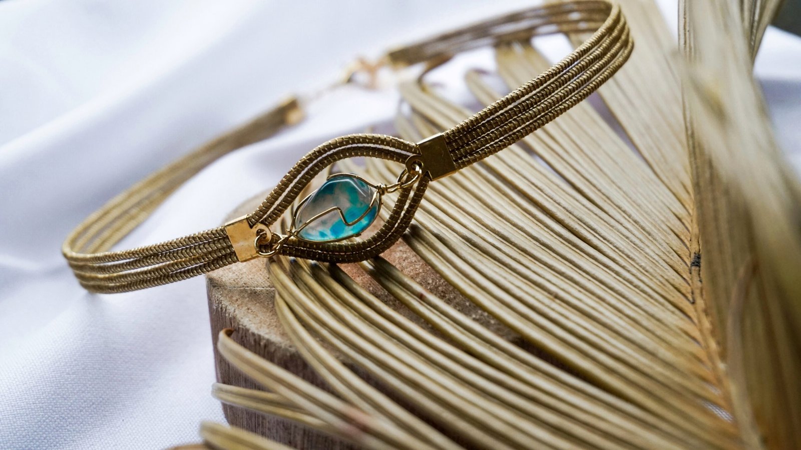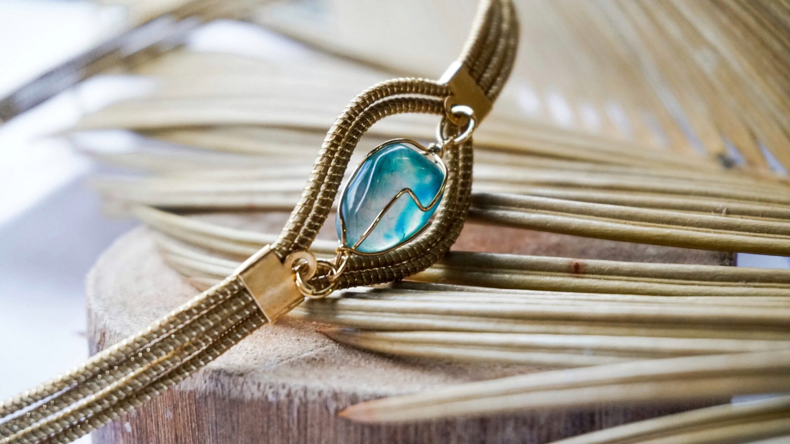 100% Plant Based, feito de uma planta rara que tem a aparência de ouro fiado e continua a brilhar depois de colhida. Forte, durável e flexível o suficiente para ser usado em acessórios.